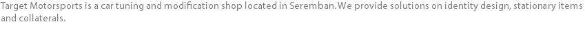 Solution provided : Target Motorsports is a car tuning and modification shop located in Seremban. We provide solutions on identity design, stationary items and collaterals.